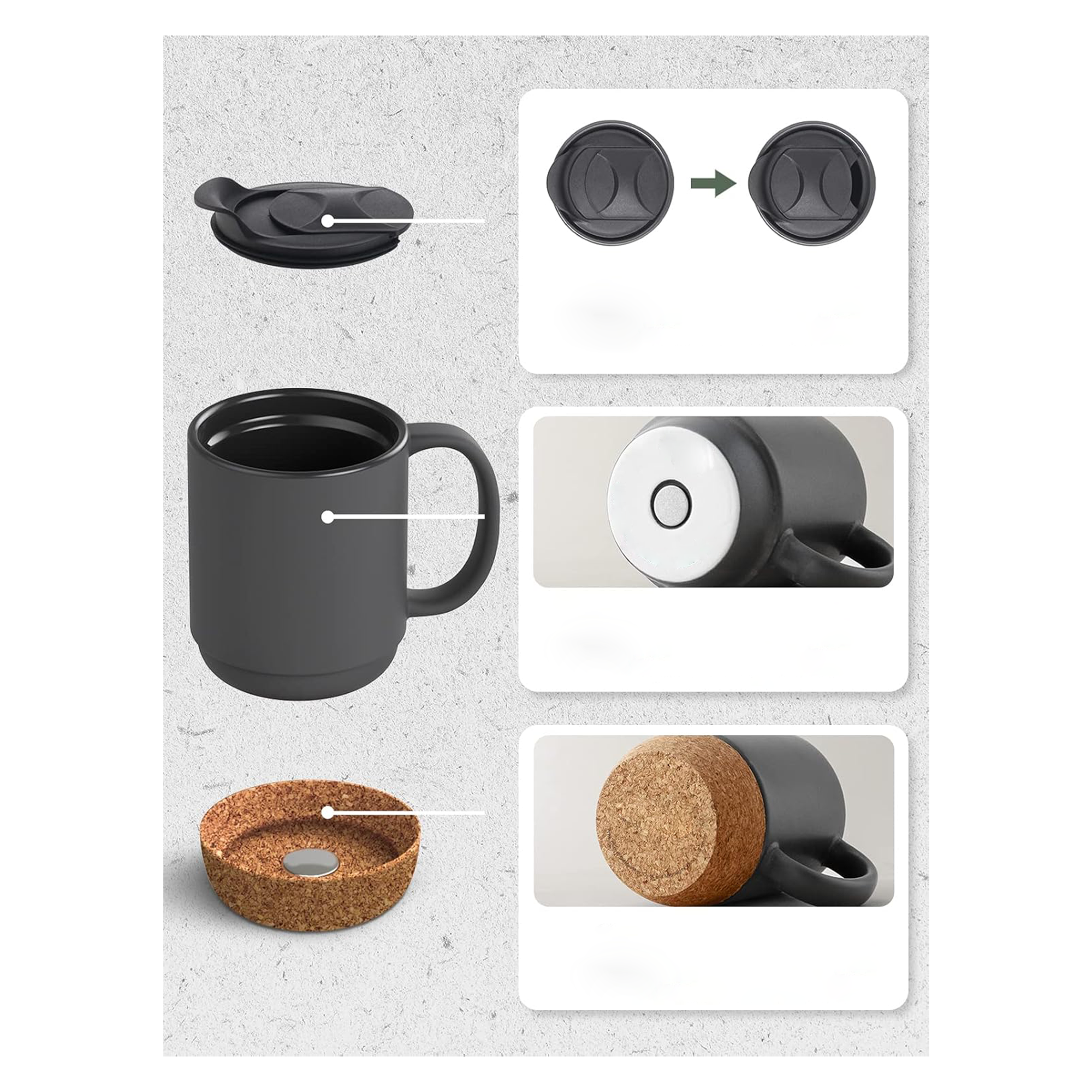 Each ceramic mug comes with a splash-resistant lid, perfect for daily use at your desk or home office. Please note: the lid is not completely leak-proof and is not meant for travel. The cork bottom protects surfaces from heat and moisture while offering a non-slip grip. The cup adds a warm, natural touch to your kitchen or table. This mugs makes the perfect gift for couples, coworkers, or friends. This ceramic mug can hold coffee, tea, hot cocoa, etc.