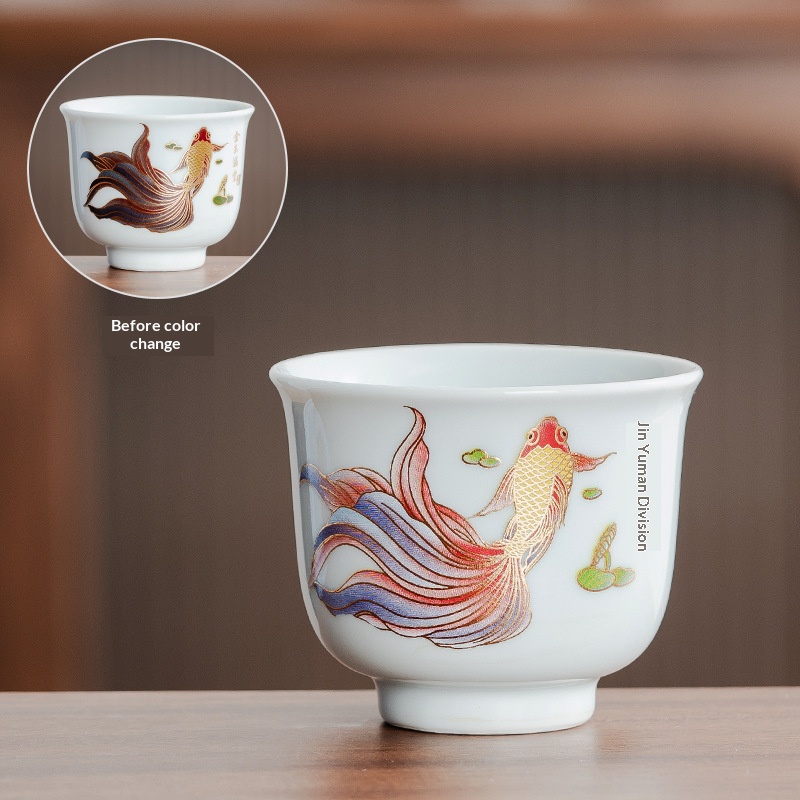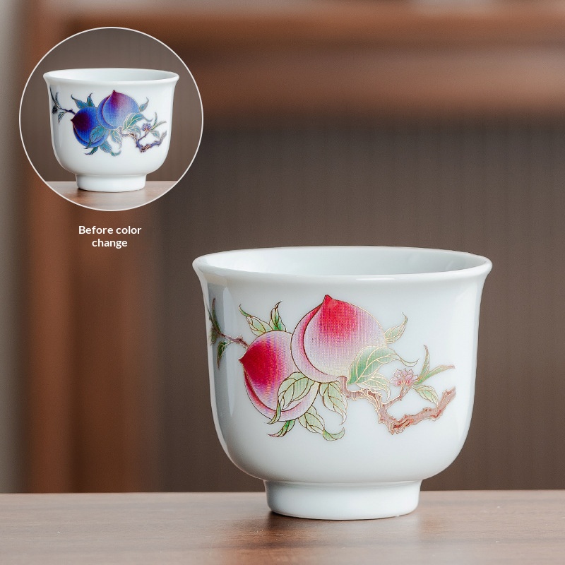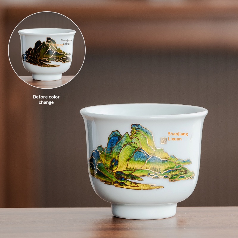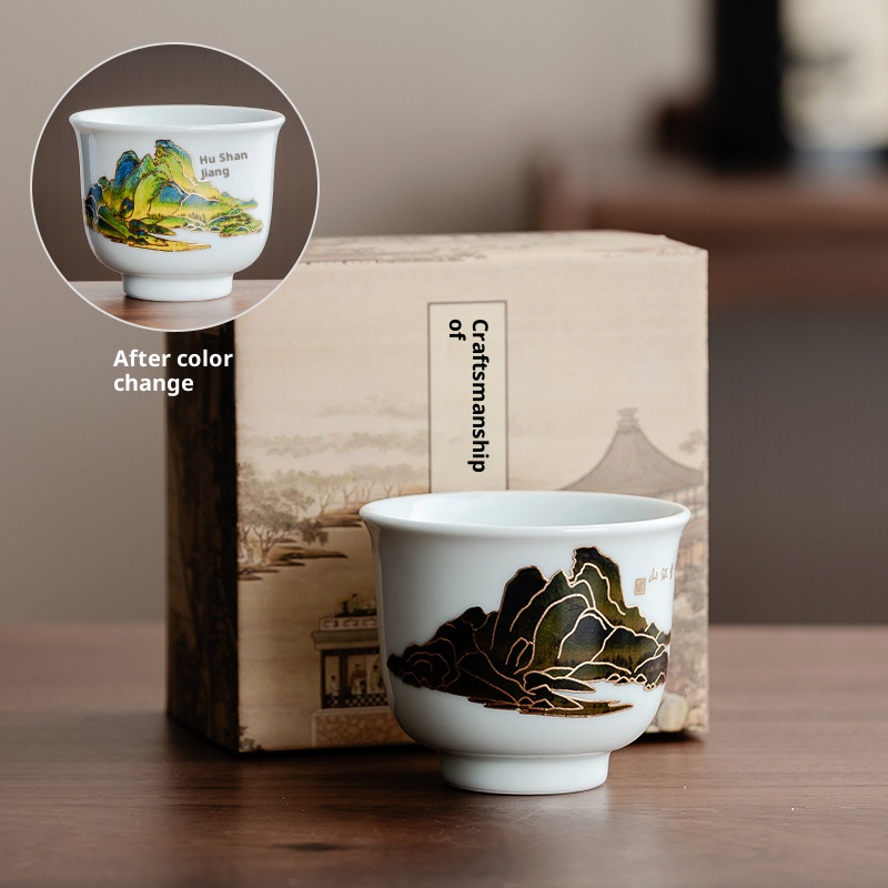 Welcome to a cup that transforms with every pour, where art meets the magic of heat. Crafted in the world-renowned kilns of Dehua, China, the Ying Sheng porcelain cup is not just a vessel for your beverage—it’s a captivating experience. Each hand-made cup features exquisite, heat-sensitive ink that reveals hidden, vibrant colors and intricate details the moment hot liquid touches its surface. Watch as tranquil black-and-white landscapes bloom into lush greens and blues, as peach blossoms turn a vivid red, or as graceful koi fish shimmer to life. This is the perfect fusion of ancient Chinese craftsmanship and delightful modern innovation for the curious and cultured American consumer.