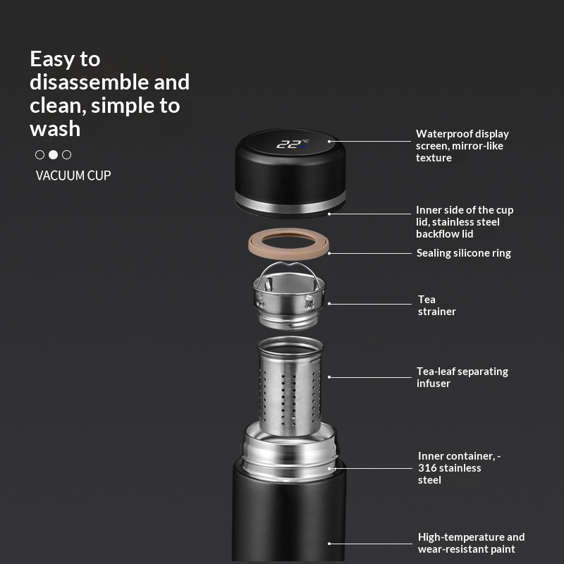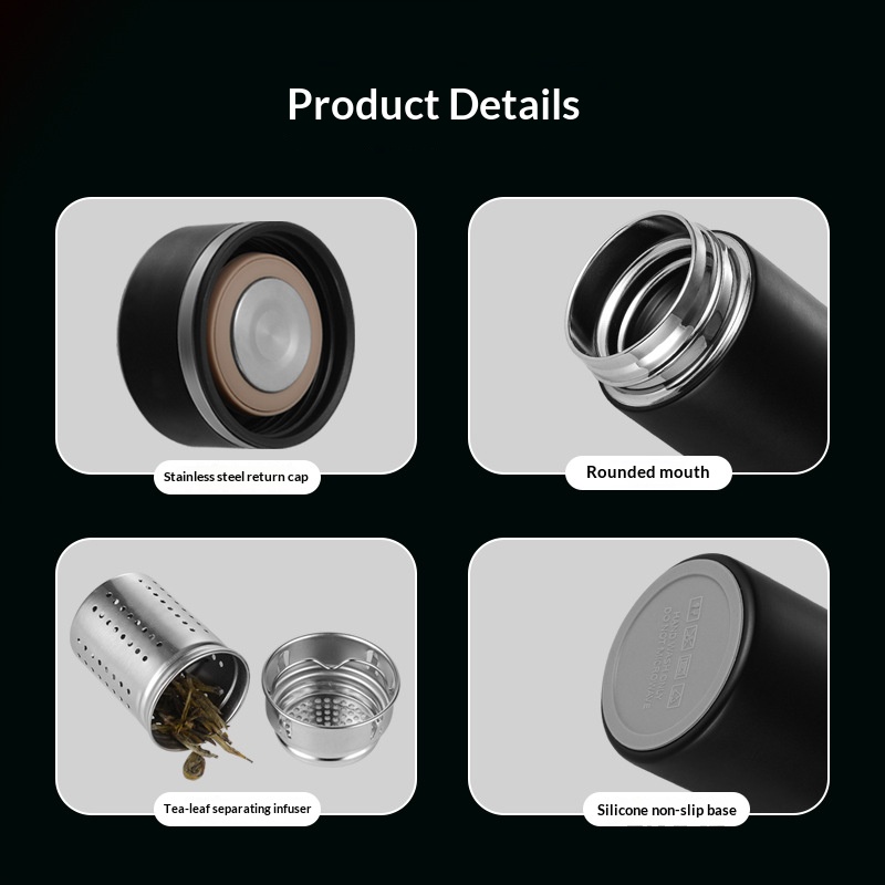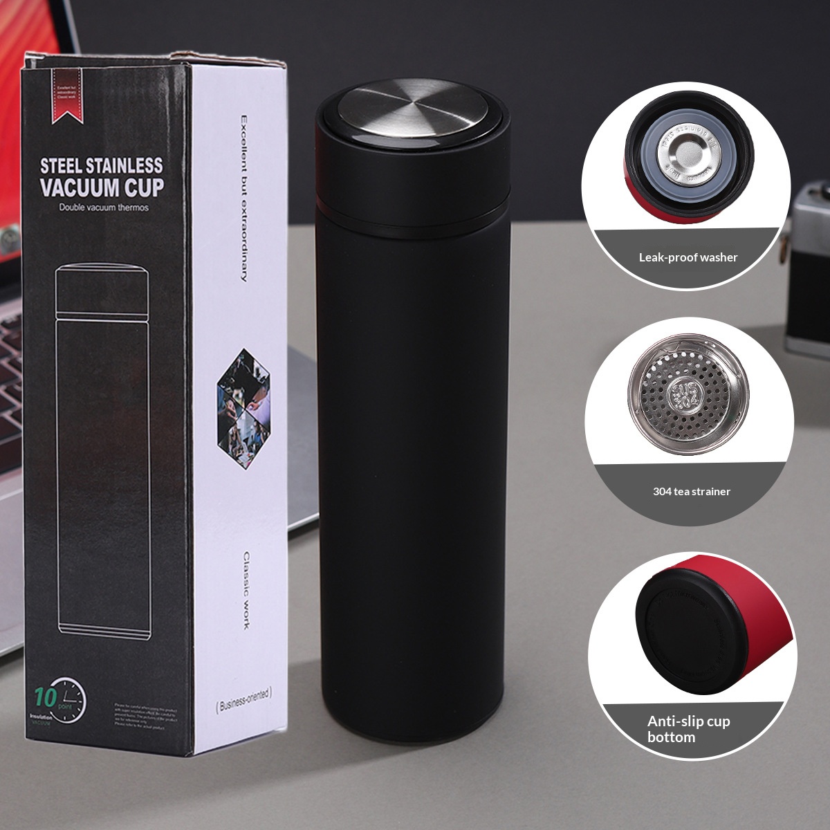 Smart Temperature Display: Stay in control with real-time temperature monitoring on the lid. Know the exact temperature of your drink instantly. Tea Infuser Design: Included 304 stainless steel tea strainer allows for convenient tea-water separation, perfect for tea lovers on the go. Exceptional Insulation: Double-wall vacuum technology maintains your drink’s ideal temperature—hot or cold—for 12-24 hours. Premium Construction: 316 stainless steel interior offers superior hygiene and taste preservation. 304 stainless steel exterior ensures rugged durability. Leak-Proof & Safe: Secure screw-on lid with a high-quality silicone seal prevents spills. Non-slip base adds stability on any surface. Large 500ml Capacity: Holds enough liquid to keep you hydrated through long meetings, road trips, or workouts. Easy to Clean: Thoughtfully designed with a wide mouth and a removable tea infuser for hassle-free, thorough cleaning. Versatile Style: Available in a wide range of sophisticated colors and finishes, from classic black/red/blue to elegant matte spray-coated options, to suit any personal style.