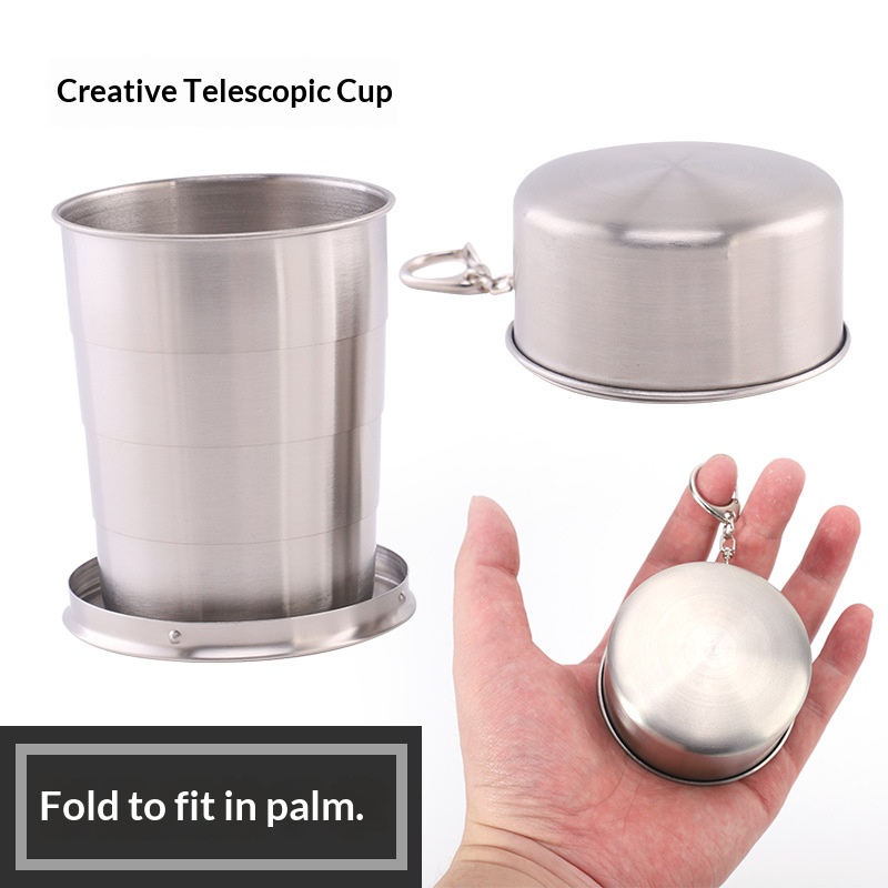 Ditch the Bulk, Not the Sip. Meet the Dailanqi Collapsible Cup – the ingenious solution redefining portable hydration. More than just a cup; it's a feat of smart, space-saving engineering designed for the modern explorer, traveler, and everyday minimalist. Whether you're hiking a mountain trail, navigating a business trip, or simply need a reliable cup on the go, this is your all-in-one drinking companion.Crafted with precision, this cup utilizes a unique telescopic folding design. With a simple push, it collapses from a full-size cup into a remarkably compact disc that fits in the palm of your hand. When expanded, it forms a sturdy, seamless vessel perfect for water, coffee, or a quick snack. Made from high-quality 201 or superior 304 stainless steel (inner and outer), it guarantees durability, easy cleaning, and a pure taste with every use. The included secure keychain allows you to attach it effortlessly to your backpack, belt loop, or keys, ensuring it’s always within reach.Choose Your Perfect Fit. We offer four practical sizes to match any need: