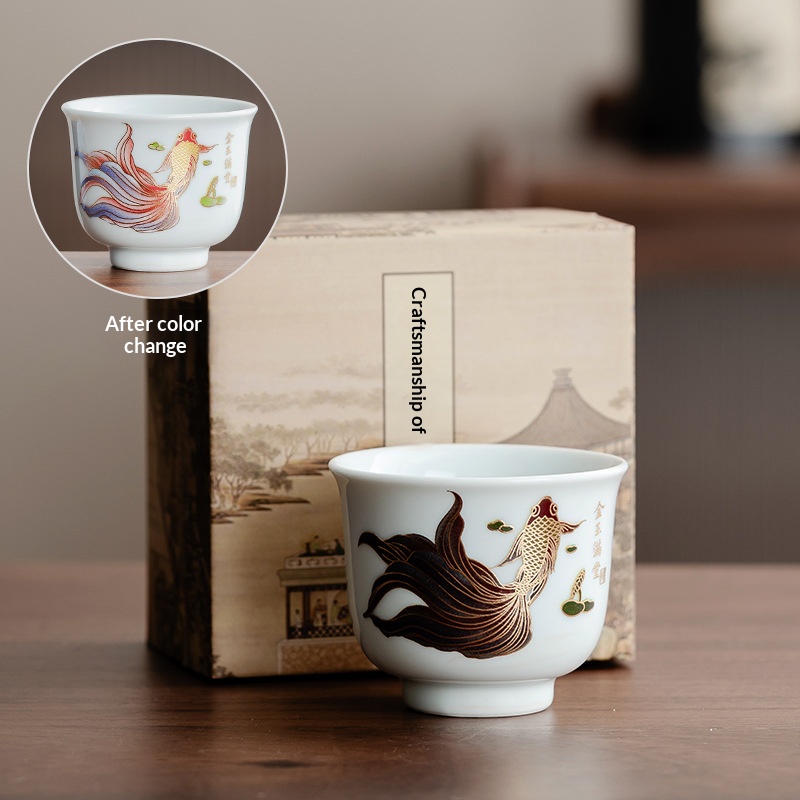 Welcome to a cup that transforms with every pour, where art meets the magic of heat. Crafted in the world-renowned kilns of Dehua, China, the Ying Sheng porcelain cup is not just a vessel for your beverage—it’s a captivating experience. Each hand-made cup features exquisite, heat-sensitive ink that reveals hidden, vibrant colors and intricate details the moment hot liquid touches its surface. Watch as tranquil black-and-white landscapes bloom into lush greens and blues, as peach blossoms turn a vivid red, or as graceful koi fish shimmer to life. This is the perfect fusion of ancient Chinese craftsmanship and delightful modern innovation for the curious and cultured American consumer.