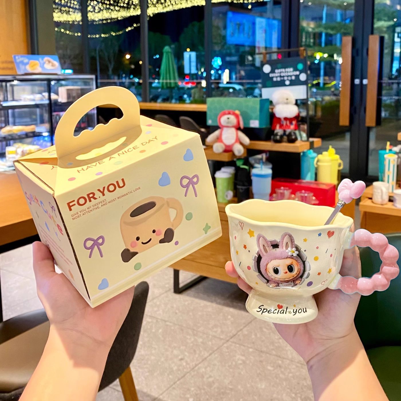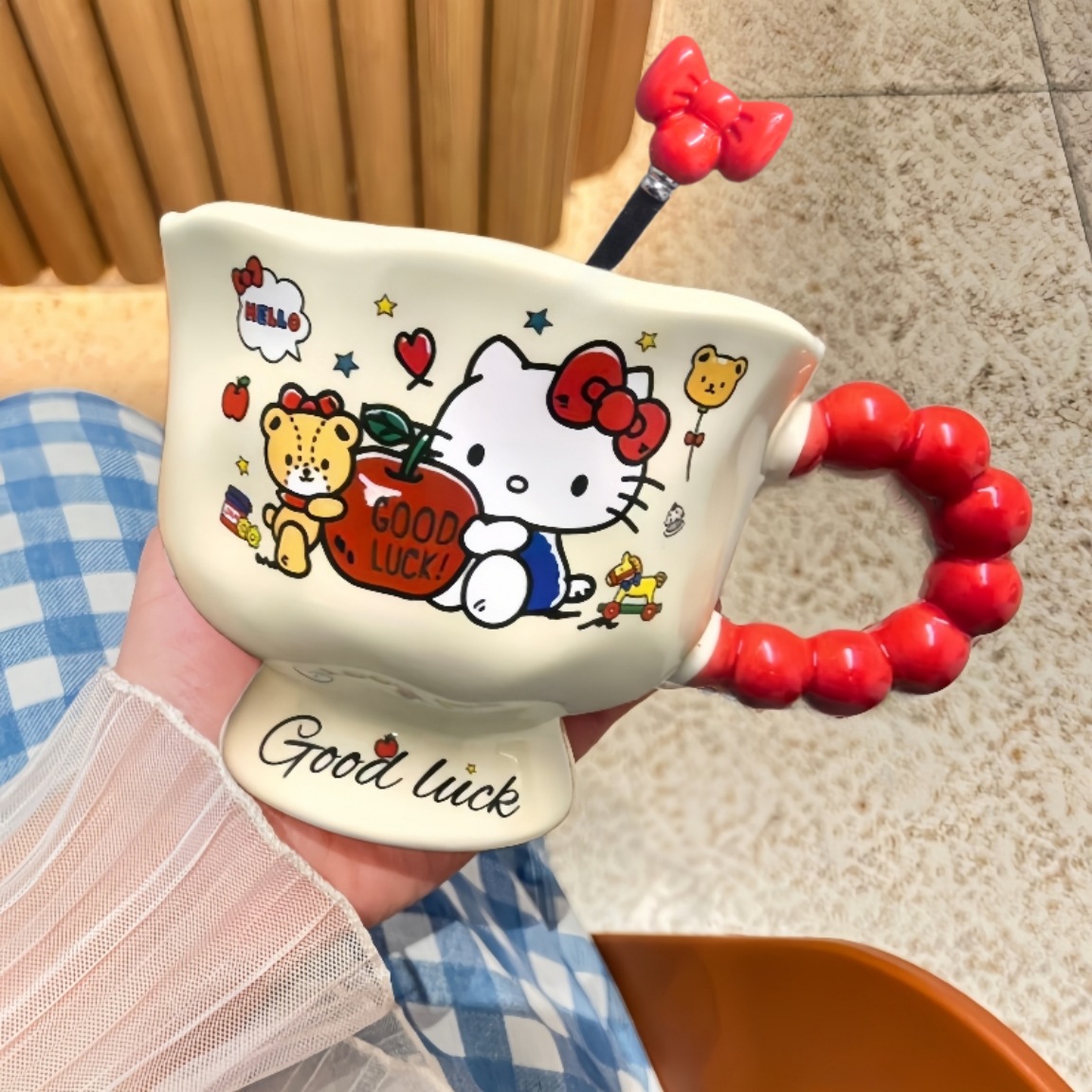 Brighten Someone's Day with a Little Cup of Joy! Introducing the Weijian Cartoon Character Mug, a heartwarming gift designed to bring a smile with every sip. This isn't just a mug; it's a cheerful companion for your coffee break, a delightful desk accessory, and the perfect token of appreciation. Each mug features an utterly charming, high-definition print of beloved characters like the gentle Brown Bunny ("Xiao Bu"), the playful Blue Puppy, the mischievous Pink Fox, or the iconic Hello Kitty with apples and lucky stars. The design is completed with uplifting messages like "HAPPY," "Good Luck," and "Special for you," making it a daily dose of positivity.Crafted with care from high-quality, lead-free ceramic, this mug is as practical as it is adorable. It's microwave-safe and heat-resistant, perfect for your morning brew or a cozy evening tea. The standout feature is its unique, colorful beaded handle—not only is it a stylish detail, but it also provides an exceptionally comfortable and secure grip. Every mug comes with its own adorable mini spoon, topped with a cute bow or charm, adding that perfect finishing touch. Generously sized at 450ml (approx. 15 oz) and packaged in a beautifully illustrated gift box that proclaims "HAVE A NICE DAY" and "FOR YOU," it’s ready to delight the moment it’s opened.