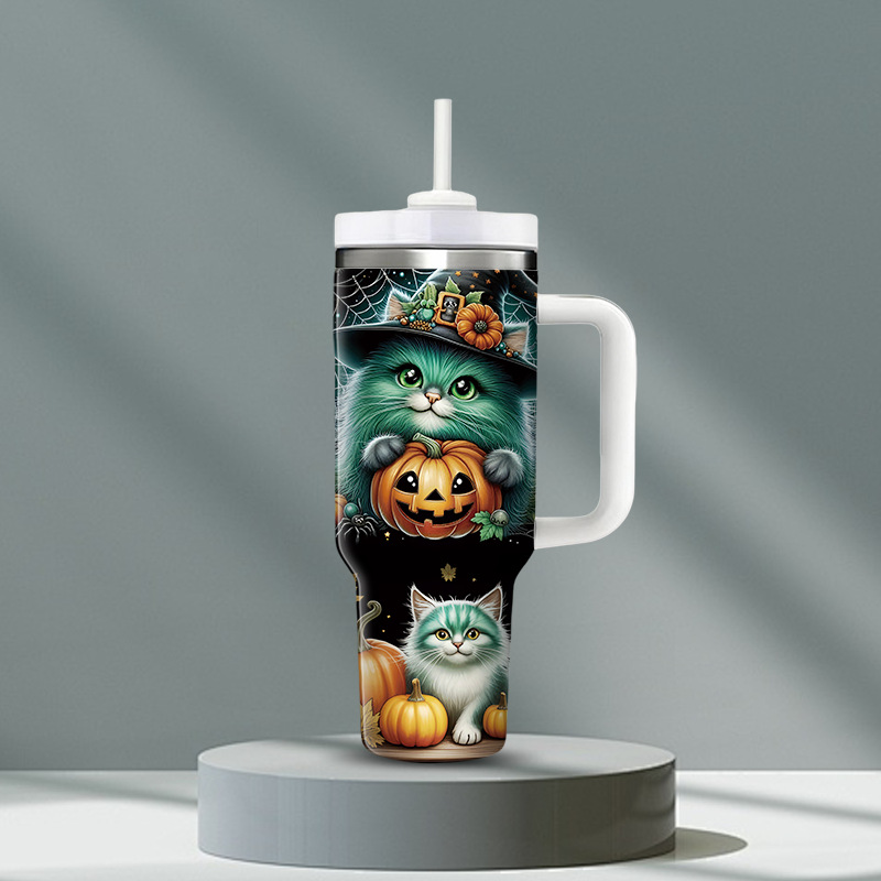 Brand: Yicai Model: bbb-40oz-1 Capacity: 40oz (Approx. 1200ml) Material: 304 Stainless Steel (Inner), 201 Stainless Steel (Outer) Insulation: 6-12 Hours (Hot/Cold) Lid Type: Straw Lid (Plastic) Features: Integrated Handle, Large Capacity, Straw Included Customization: Yes (3D/5D Printing, Logo Application) Design Shown: Halloween Cat (Multiple other designs available) Packaging: Single Unit, Basic Packaging