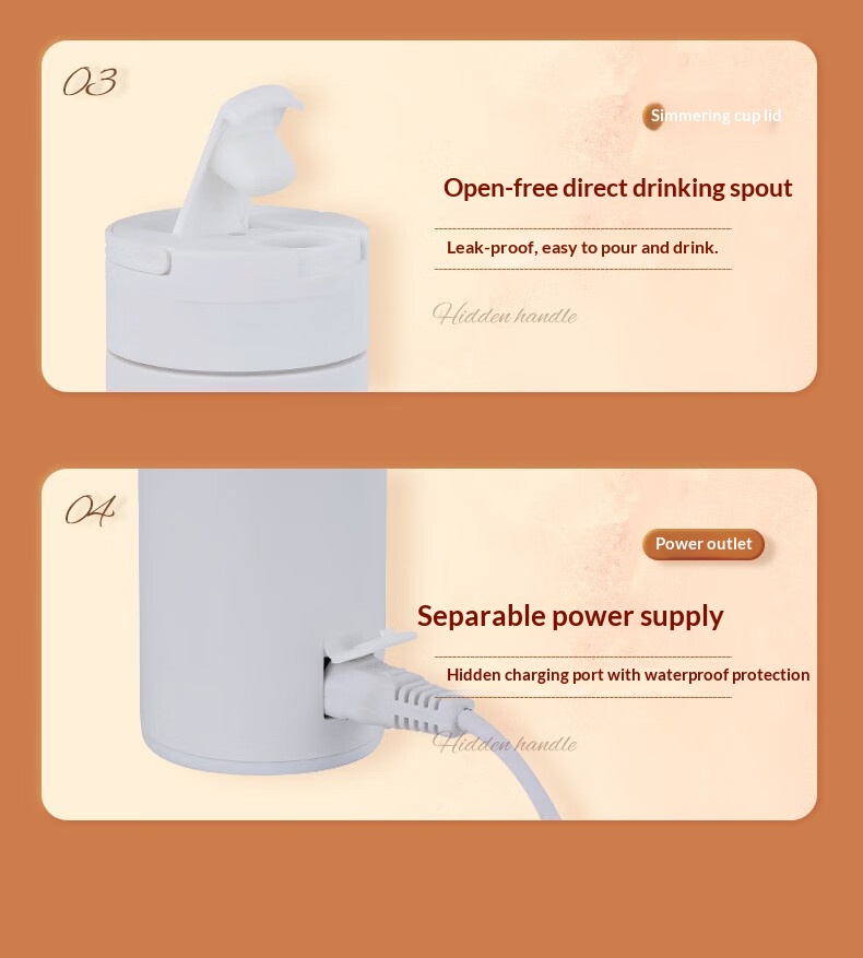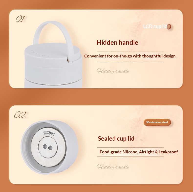 - Travel-Ready Smart Design: Thoughtful details make daily use effortless. The hidden carry handle tucks away neatly. The leak-proof, sealed lid (with a direct-drink spout on some models) prevents spills in your bag. The separate, hidden power base is splash-resistant for safety.