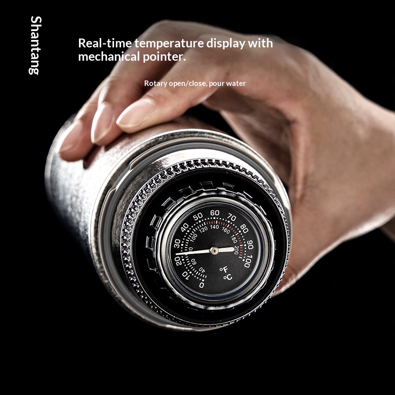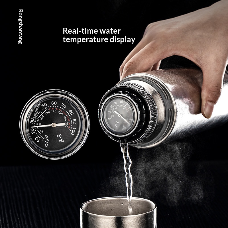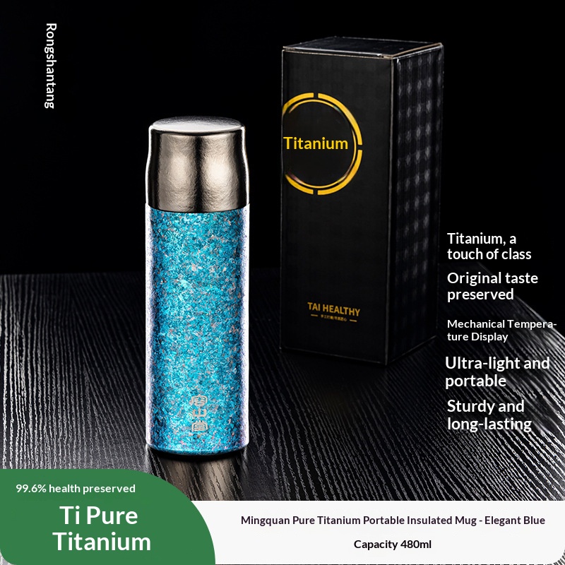 Discover the art of perfect brewing, anywhere. Rongshan Hall presents a masterpiece where ancient Chinese craftsmanship meets the purity of aerospace-grade material. This isn’t just a thermos; it’s a portable tea sanctuary, designed for the connoisseur on the move. Crafted entirely from 99.6% pure titanium for both inner and outer walls, it guarantees a perfectly neutral taste—no metallic aftertaste, just the pure, unadulterated flavor of your finest tea leaves. Experience what it truly means for your drink to stay 99.6% fresh.Engineered for the Perfect Brew:This cup is a tea lover's ultimate tool. The built-in pure titanium tea infuser allows for precise tea-water separation, letting you control the steep to your exact preference and preventing bitterness. The standout feature is the sophisticated mechanical temperature gauge on the lid. With a classic analog dial, it provides clear, real-time water temperature readings at a glance—no batteries needed, just timeless engineering. The secure screw-top lid ensures a leak-proof seal for complete portability.A Statement of Refined Heritage:Choose from two elegant, timeless finishes that reflect its premium quality. "Haoyue Silver" (Bright Moon Silver) offers a sleek, modern metallic sheen, while "Yashi Blue" (Elegant Scholar Blue) presents a deep, sophisticated hue. For the ultimate presentation, pair your cup with our exclusive "Thousand-Mile Mountains and Rivers" heritage-style drawstring cup bag, transforming it into a portable work of art and the most thoughtful gift.With a generous 480ml capacity and effective insulation, it’s perfect for your desk, travels, or outdoor adventures. Remarkably lightweight and durable, it embodies the strength-to-weight ratio titanium is famous for. It’s the ideal companion for the office, car, hikes, or as a distinguished gift that conveys deep appreciation for quality and culture.
