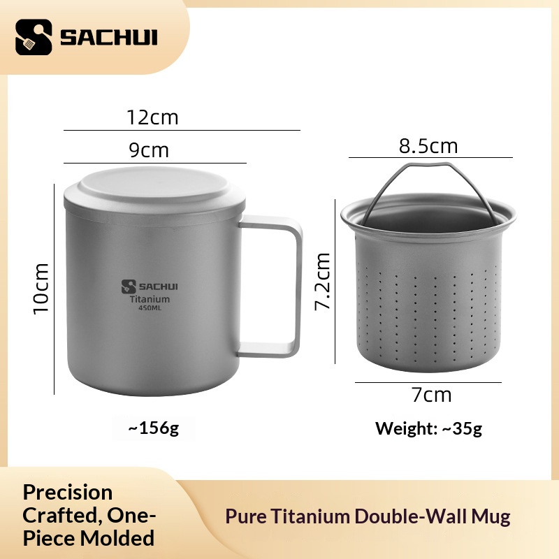 Brand: SACHUI Material: 100% Pure Titanium (Double-Wall) Capacity: 450ml Mug Weight: 156g Strainer Weight: 35g Finish: Fine-Polished, One-Piece Formed, Matte Grey Features: Vacuum Insulation, Secure Lid, Ergonomic Handle Style: Sporty, Minimalist Origin: Jieyang, Guangdong, China